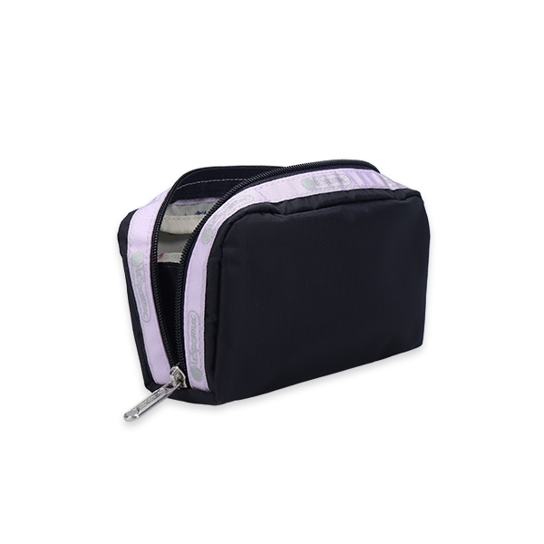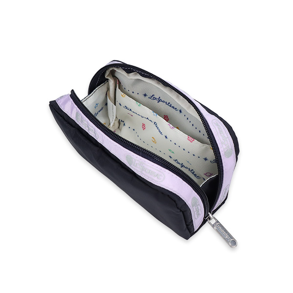 コの字型のファスナーで間口が大きく開く、横長のスクエア型のポーチです。
