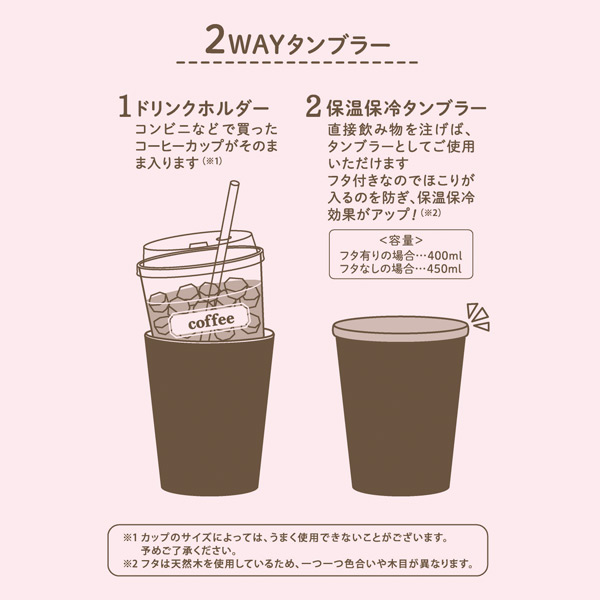 ペットボトルやコーヒーカップを容器ごと入れてドリンクホルダーとしてや、直接飲み物を注いでタンブラーとしても使える2WAY仕様♪